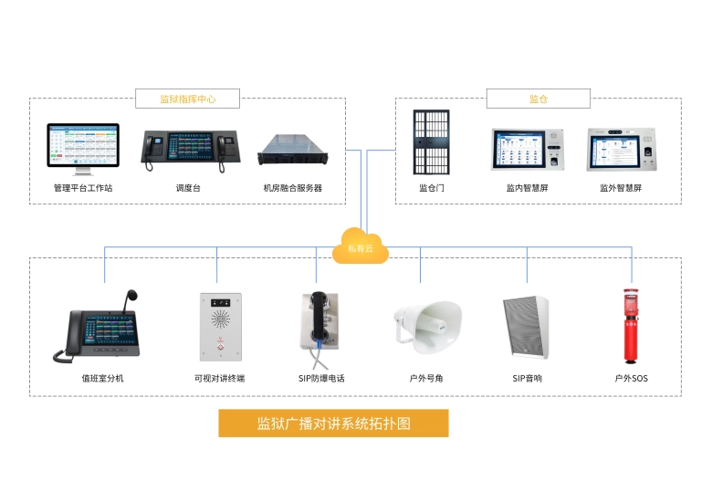 在监狱监控中心配置可视化广播调度台和SIP对讲主机作为指挥系统,对监区各安全区域的智能终端进行统一管理、实时监控。在牢房、监舍楼、岗楼、会见楼和公共活动区域安装紧急求助对讲设备、摄像头及SIP音箱;发生应急事件时,监区监控中心可以发起广播、对讲功能、视频监控联动现场情况、实时监听各个牢房等区域;发生警情时,监区人员可按下求助终端触发报警,并与值班室室或监控中心实现双向对讲,可以发起多方会商,及时处理事件。