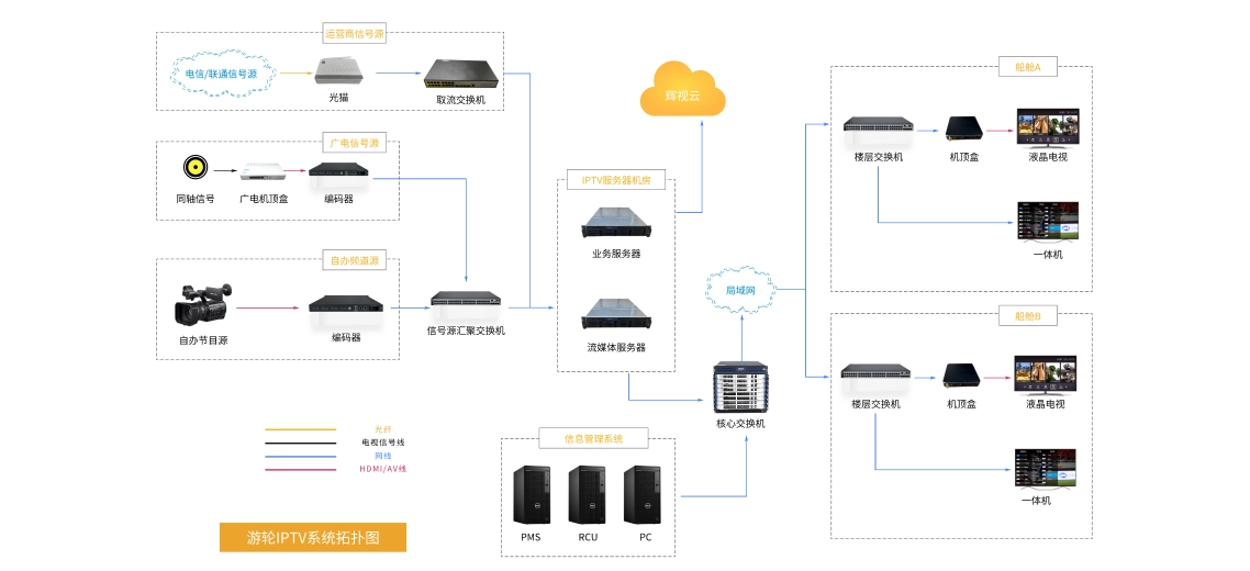 宏辉智通智慧游轮视讯互动系统为游轮用户提供了包括直播编码器,数字/卫星接收机,流媒体服务器,IPTV中间件,以及用户“辉视通”智能互动控制器的端到端的IPTV解决方案