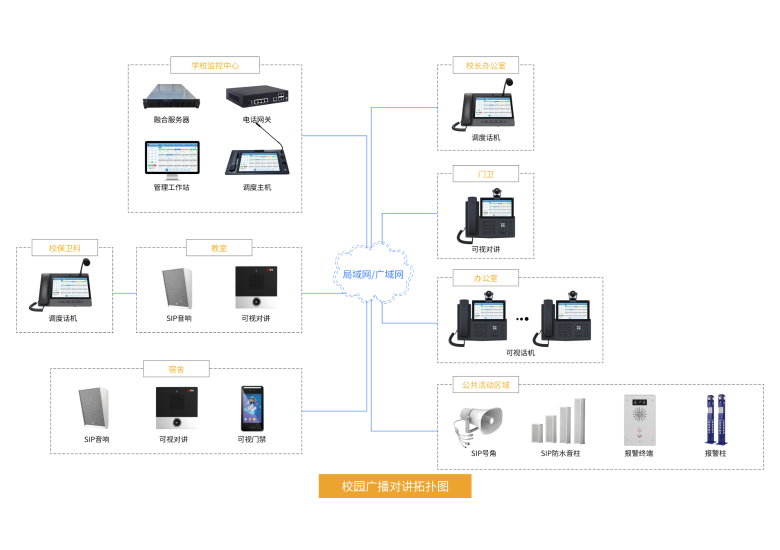 学校广播系统是一种专门设计用于教育机构的内部通信和信息传播工具。它在学校的日常运作中扮演着至关重要的角色,包括紧急情况处理、信息发布、教学辅助和校园管理等方面。辉视SIP广播对讲融合系统实现对讲、广播、门禁、监控、报警和办公电话等多个子系统互联互通,各子系统资源共享和集中管理,即减少系统投资及维护成本,还可提高监管效率及应急处理能力。