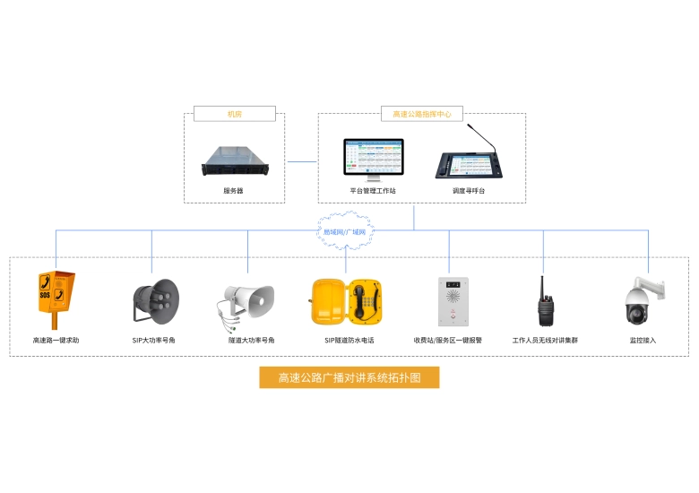 核心功能包括:紧急对讲(隧道 / 服务区终端一键呼叫,调度台可视化接警并调监控);精准广播(按区域推送路况、预警,支持全网应急播报);多系统联动(对接监控、交警系统,异常事件触发自动广播)。