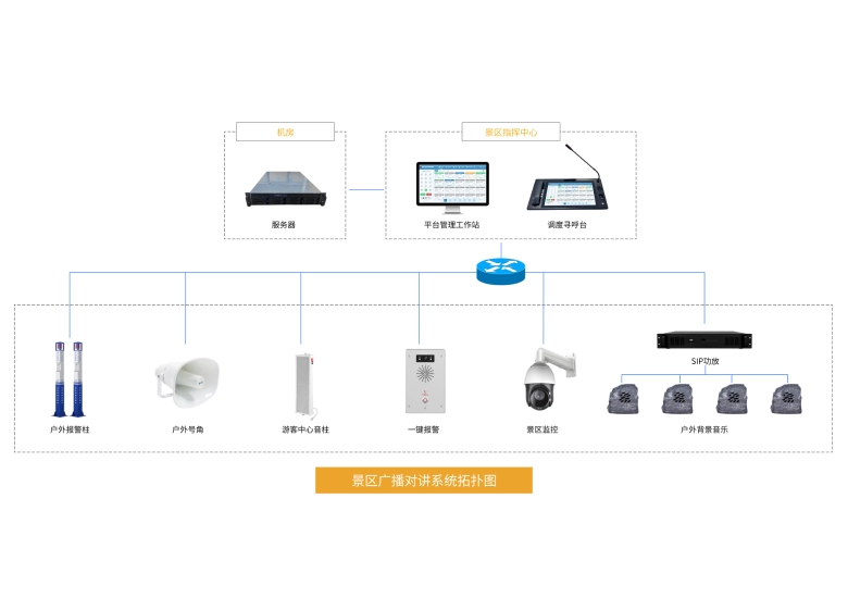 为解决景区通信分散、应急响应慢及服务效率低的问题,方案基于 SIP 协议构建 IP 化广播对讲体系,覆盖游客中心、观景台、步道、商铺、安保岗亭全场景,整合求助终端、广播音箱与调度平台。