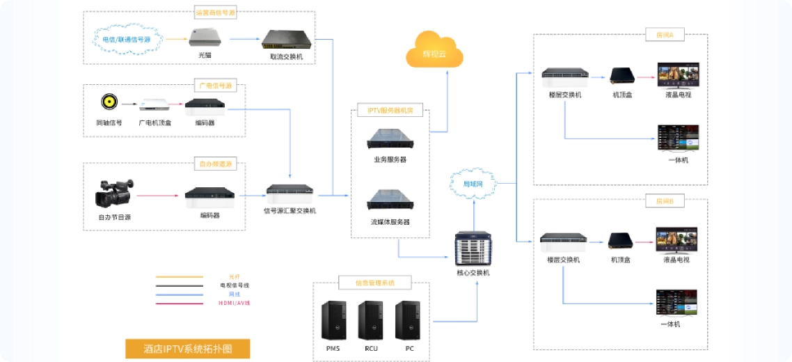 通过光纤等连接核心交换机与客房机顶盒、公共区域终端,支持 PoE 供电,扩展能力强。