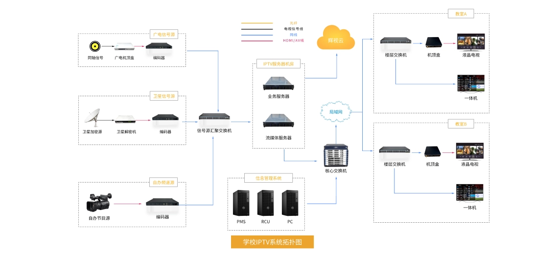 学校 IPTV 解决方案基于校园现有网络架构,通过 IP 传输技术构建集教学、管理、文化传播于一体的多媒体平台。系统支持多终端接入,覆盖教室大屏、宿舍电视、教师办公设备及学生移动终端,实现资源高效触达。