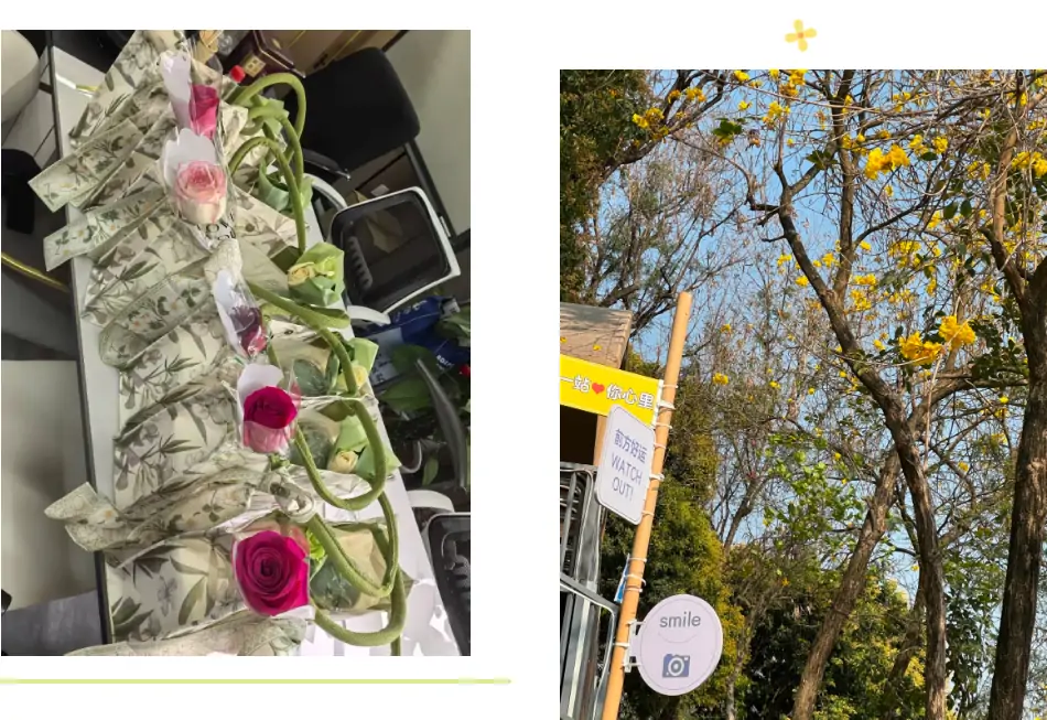 清晨的薄雾还未散尽,公司团队的车辆已悄然驶入松山湖生态秘境。女同事们手提公司为女神节精心准备的缤纷花包,包身萦绕的花丝与草瓣在晨风中曼舞轻摇,恍若将满园春色凝萃于指尖流转;男同事们则肩扛果篮、零食箱与冰饮,满载着生活的烟火气。车轮碾过满地金黄花铃木铺就的"流动油画",我们开启了这场"湖光山色与都市绿洲"的诗意碰撞。