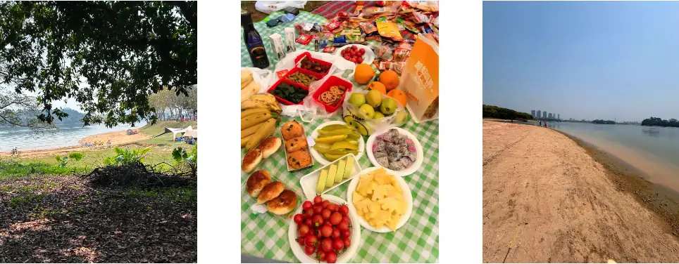 天幕帐篷在滨湖草坪绽开的刹那,食物便挣脱了塑料盒的桎梏。青翠香梨与焦糖色可颂在藤编篮里玩撞色游戏,耙耙柑剥开时溅起的汁水在餐布晕染出小太阳,火龙果切面如泼墨山水,连小鱼仔都从铝箔袋探出头来,偷看风铃花瓣飘进椰奶拿铁。