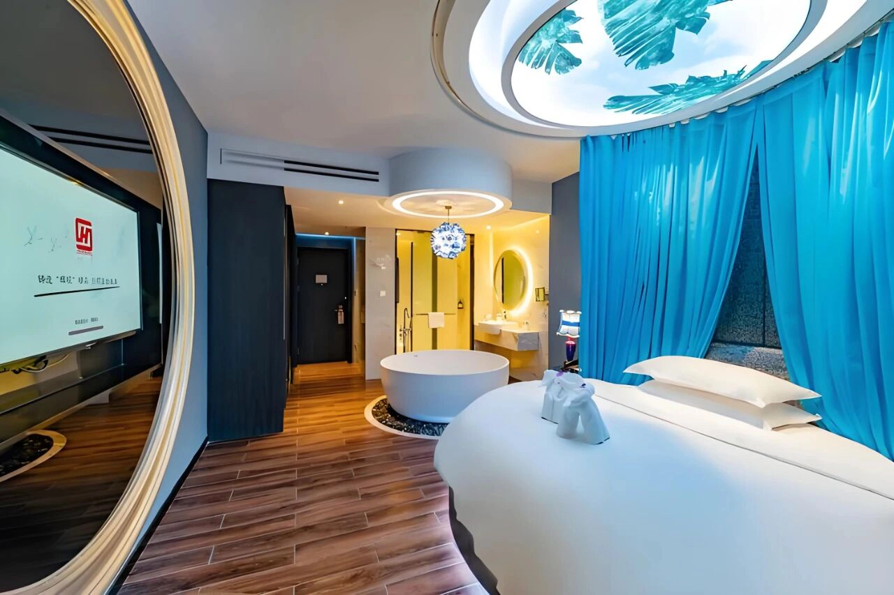 智能赋能的文化栖居 酒店集客房、餐饮、宴会、棋牌于一体,涵盖家庭房、蜜月套房等多元房型,并深度融合智能客控系统。在巴厘岛风情、地中海主题等客房中,宾客可一键控制室内环境,通过电视系统便捷获取服务,实现“文化体验”与“智慧住居”的无缝衔接。